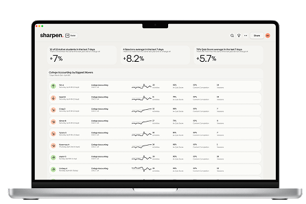Sharpen Advantage is the responsible AI learning solution institutions need to increase retention and lower DFW rates. Educators get tools to identify students' knowledge gaps and intervene early. Using vetted content from Sharpen's growing library, administrators scale student success while students get AI study tools that promote learning, not loopholes.
